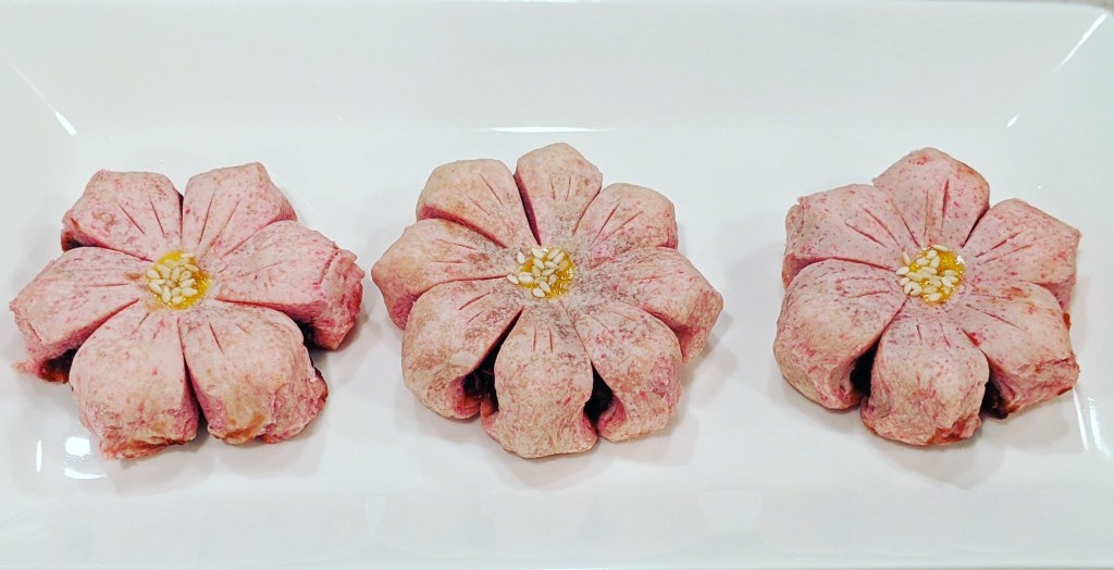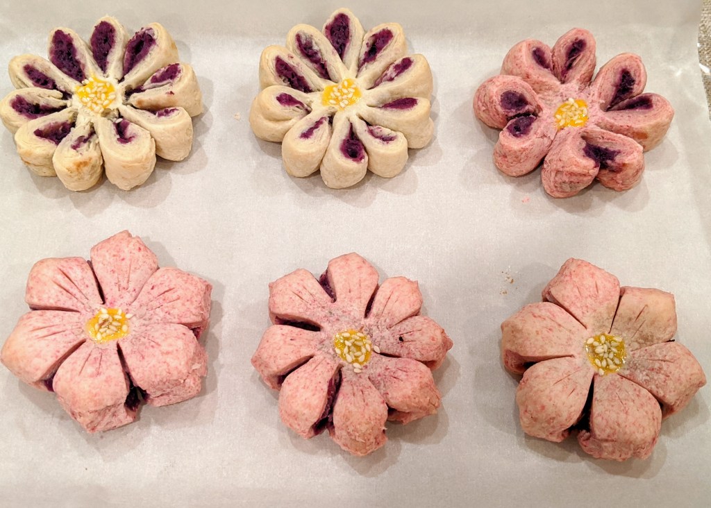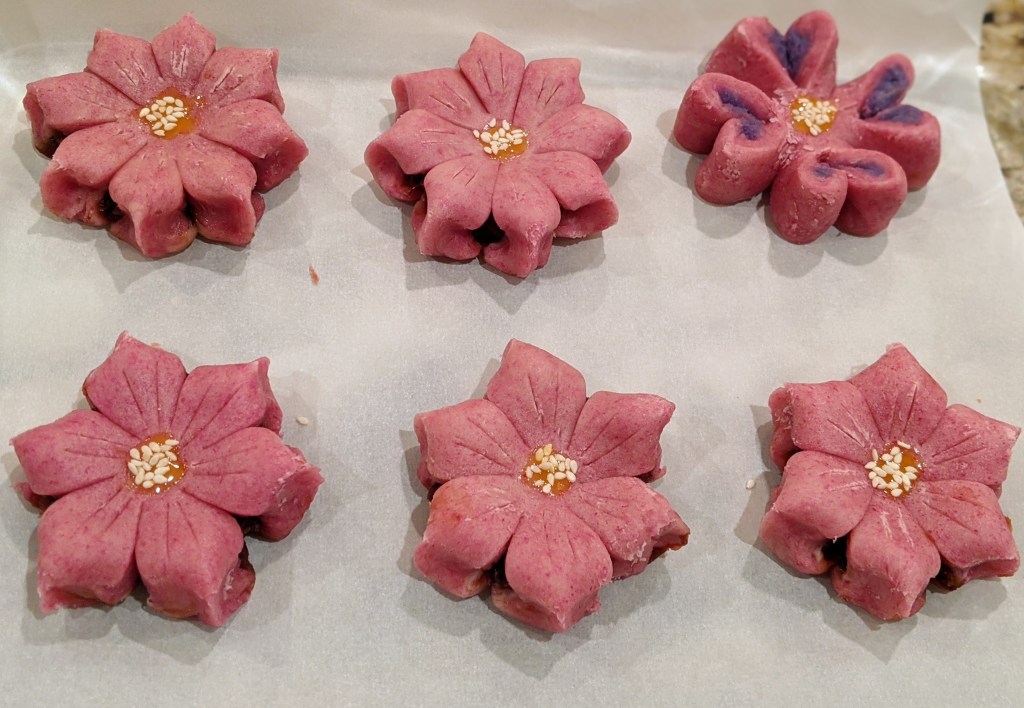 取一半油酥,加red food coloring调成粉红色. If you care, you can buy natural plants based food coloring.