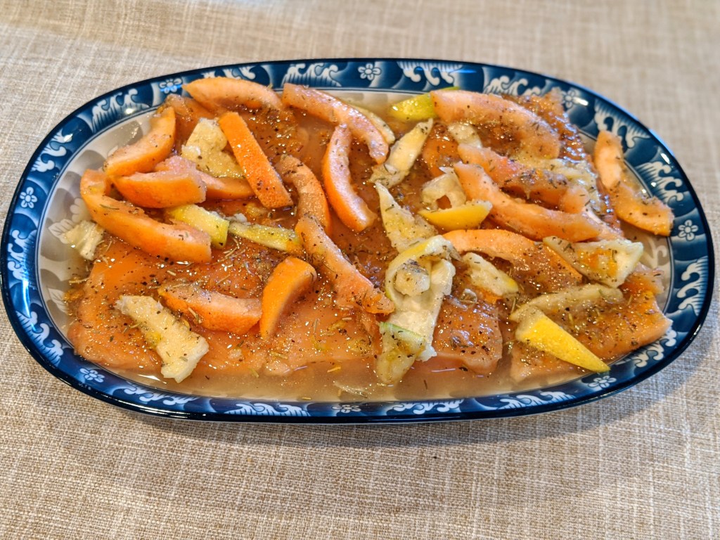 - sugar: salt 2:1, I used 1/2 cup sugar, 1/4cup salt, a bit lemon zest, a bit grapefruit zest, 1/2 tsp grounded black pepper, half of the juice from the first step, mix well