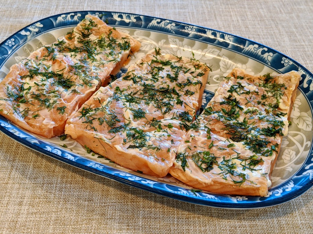- take the salmon out, remove the marinade, wash slightly and pat dry.