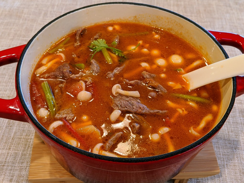 - 🥩Add 1 tbsp oil to the beef, to avoid sticking together. Put the beef slices to the boiling soup, piece by piece. It should only take ~2mins to cook, during this time, add the following:
