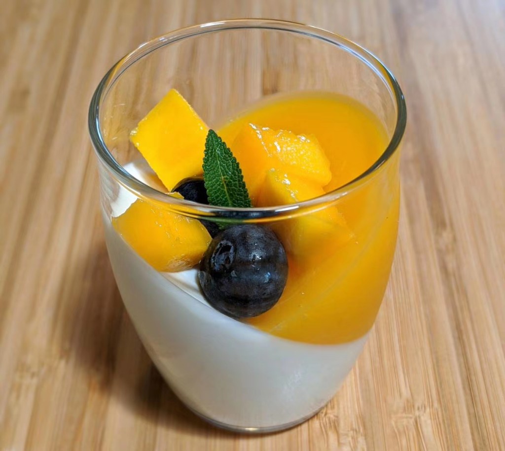Note that if you want to add a fruit jelly layer, you can do it after refrige the Panna Cotta base for about an hour, not 2 hours.
