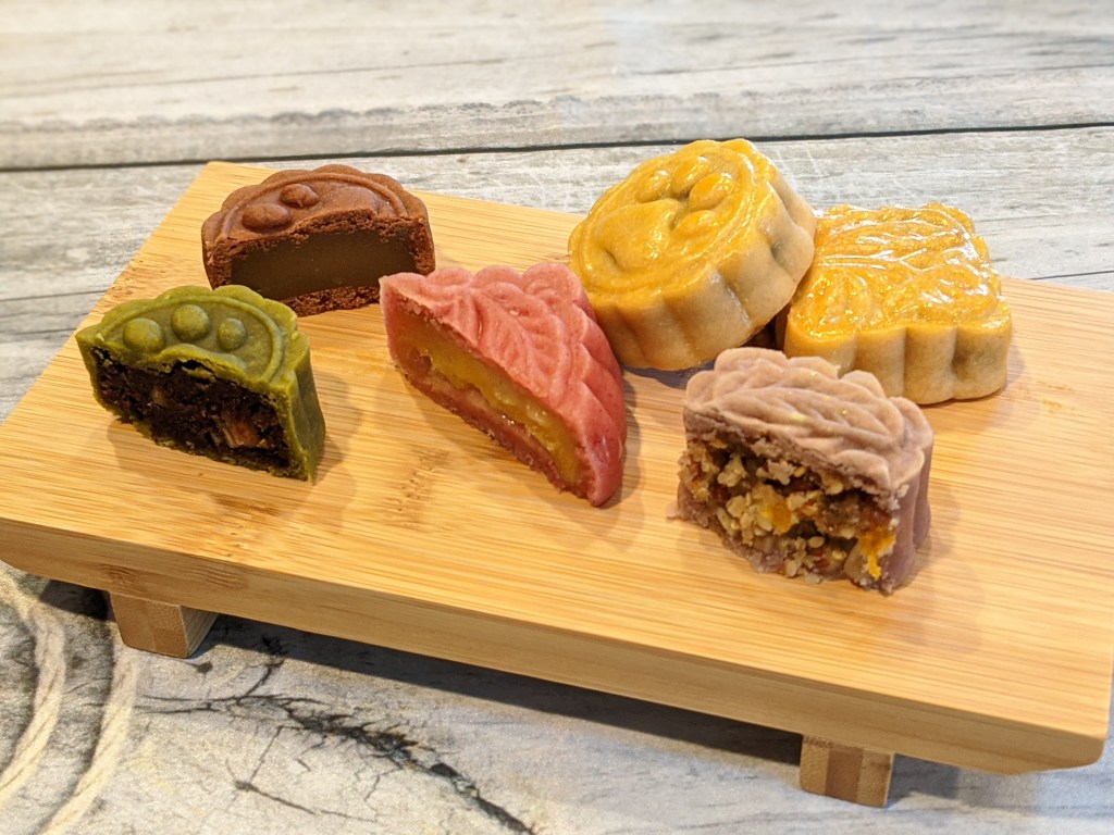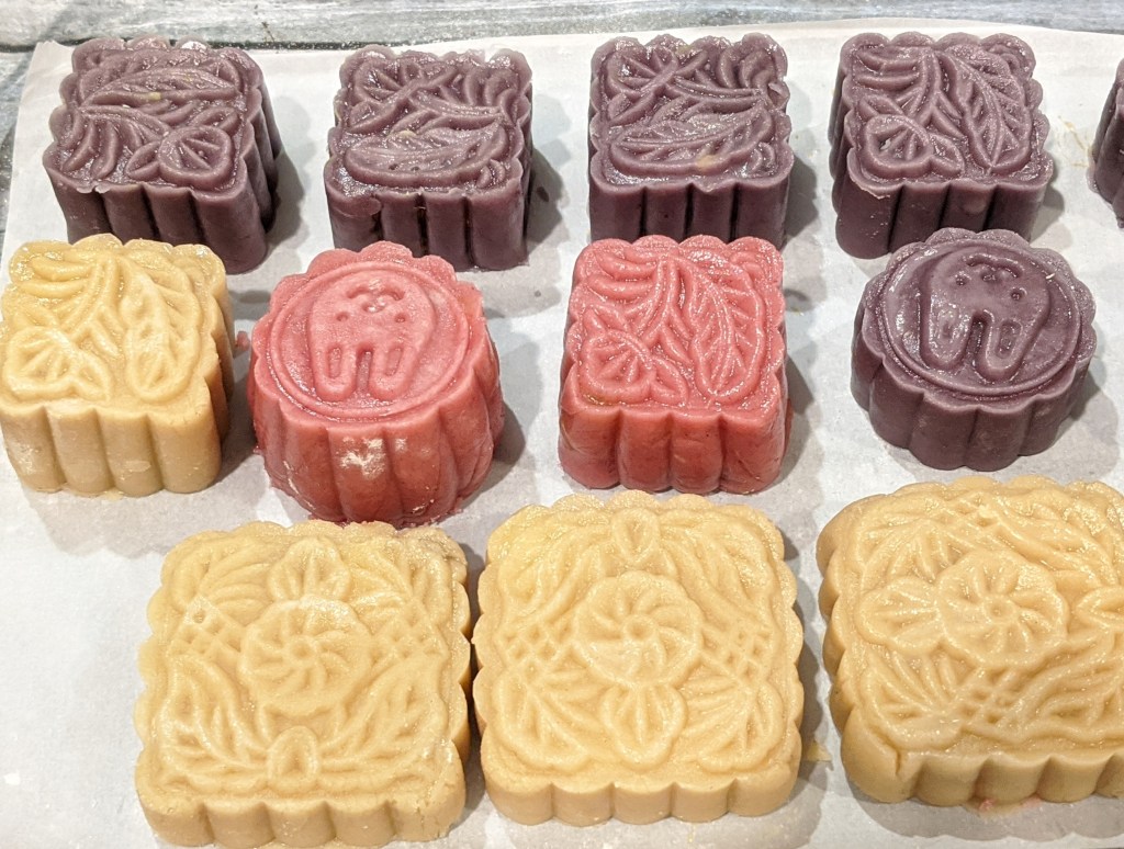 做了各式各样的月饼🙂:原色,巧克力,抹茶,紫色(taro的颜色)和粉色(strawberry的颜色)。